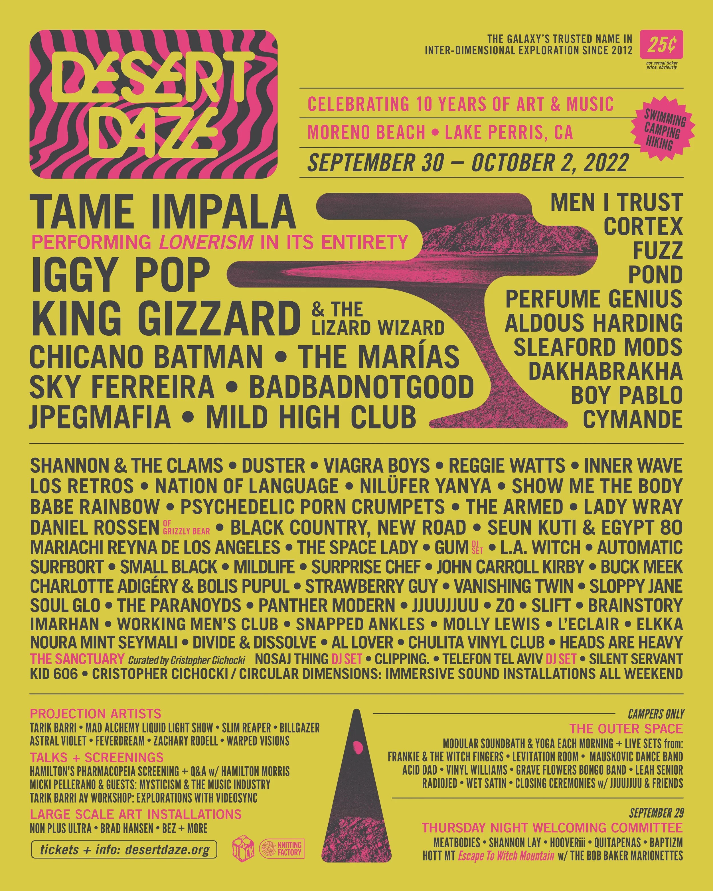 Desert Daze, a festival that celebrates the melding of nostalgic rock music and art forms, has dropped a bombshell of a line-up for it’s 10 year anniversary. Featuring massive headline acts such as Tame Impala, Iggy Pop, and King Gizzard & the Lizard Wizard, to new and longstanding artists and bands from the community like Shannon & the Clams, Viagra Boys, L.A. Witch, Babe Rainbow, Surfbort and so many more, we can confidently say Desert Daze is the place to be this September!